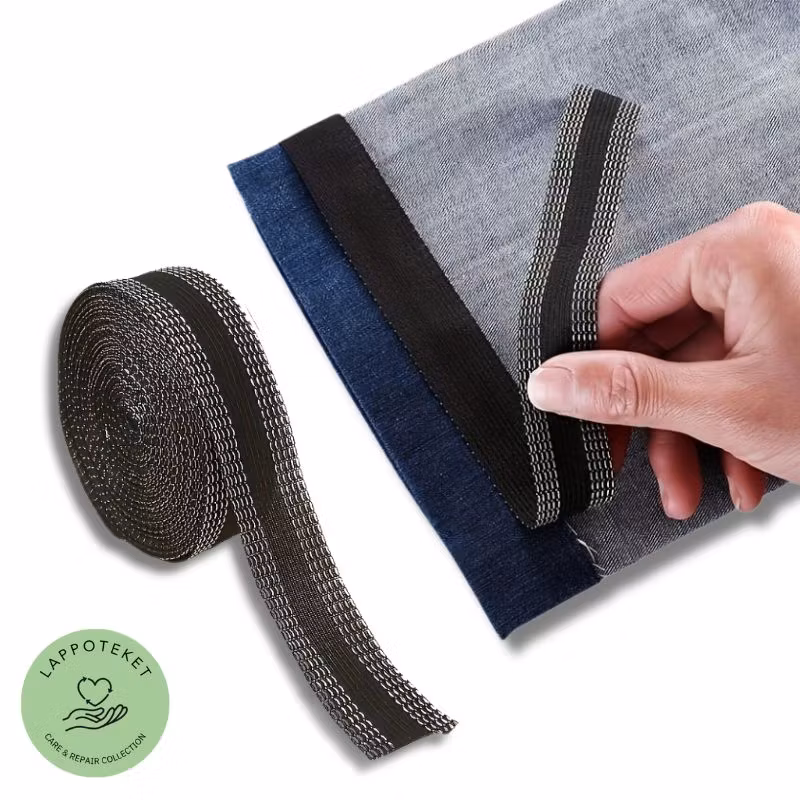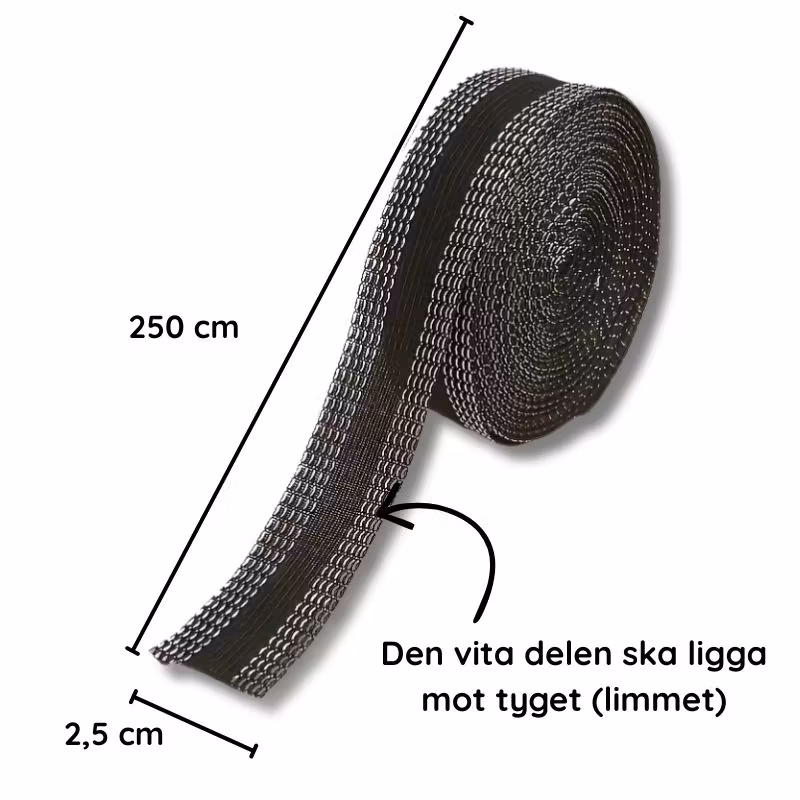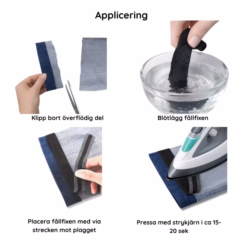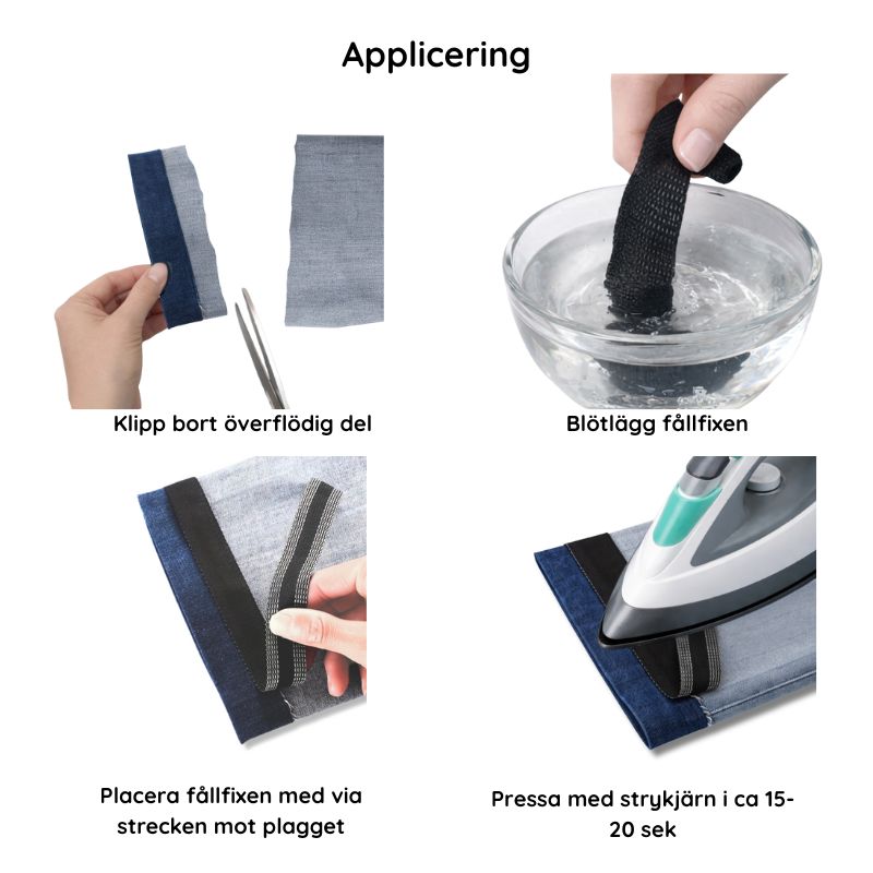 - Stryk: Pressa med strykjärnet direkt på bandet i ca 10-15 sekunder. Låt svalna helt så att limmet härdar ordentligt.