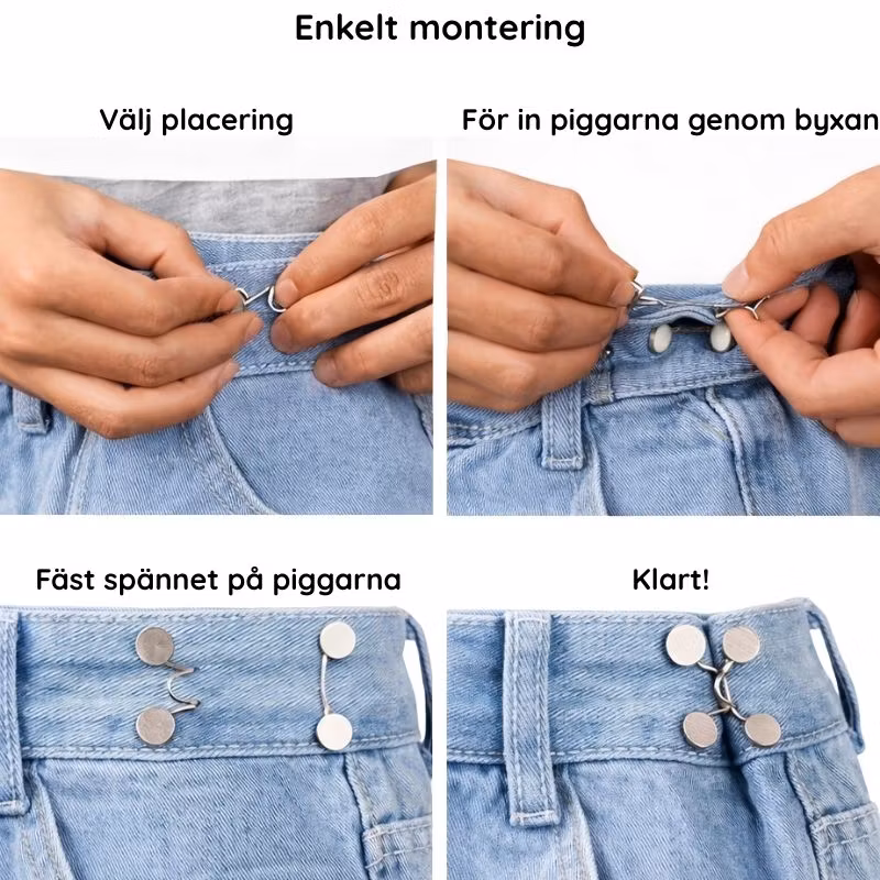 Dessa spännen är helt löstagbara och återanvändbara. Du fäster dem enkelt med de medföljande knappnålarna på valfritt ställe längs midjan, hakar i dem, och vips så sitter byxorna som gjutna!