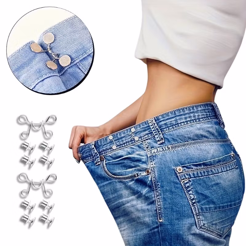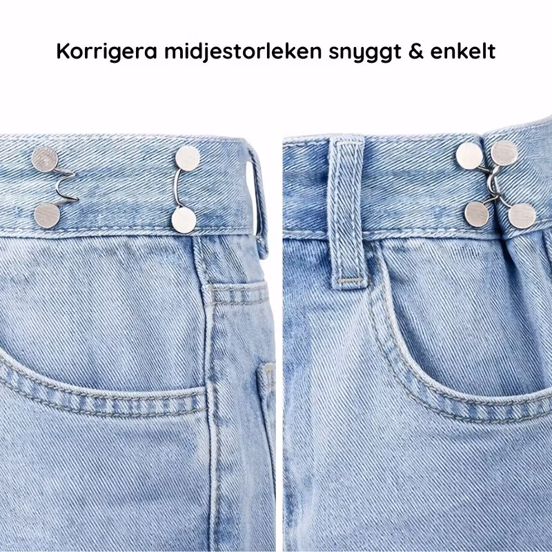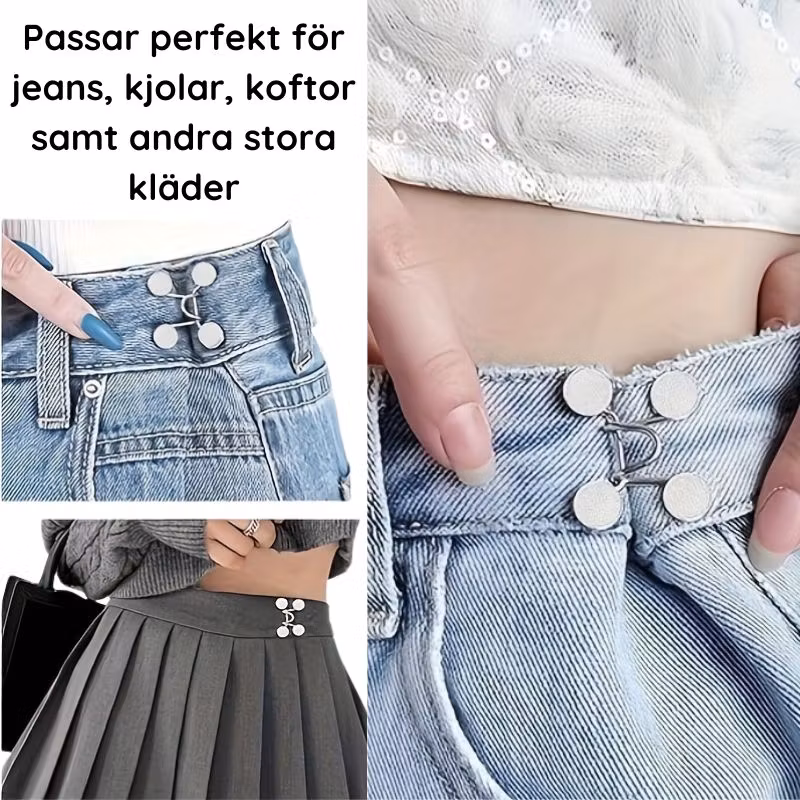 Har du hittat de perfekta jeansen men midjan är för stor? Nu kan du enkelt justera midjemåttet på dina byxor, kjolar eller shorts utan att behöva använda bälte eller sy om plagget. Våra justerbara midjespännen fungerar som små, snygga krokar som drar ihop tyget och ger en perfekt passform samtidigt som de blir en dekorativ detalj på linningen.