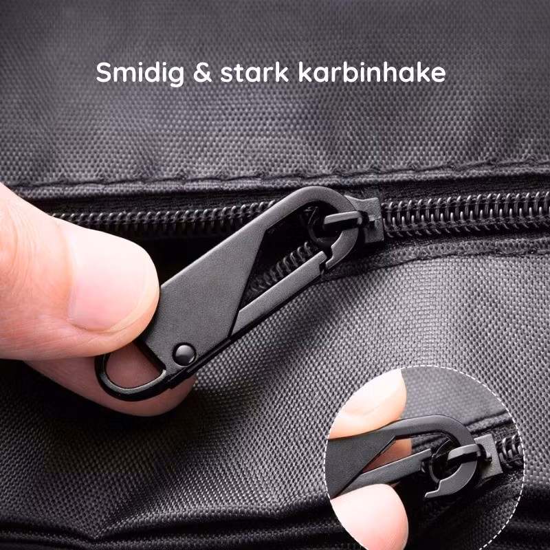 - Smart Karbinhake: Ersättningsdragaren fungerar som en liten karbinhake. Tryck in spärren, fäst den i löparen och släpp. Den sitter stenhårt och tål tuffa tag.