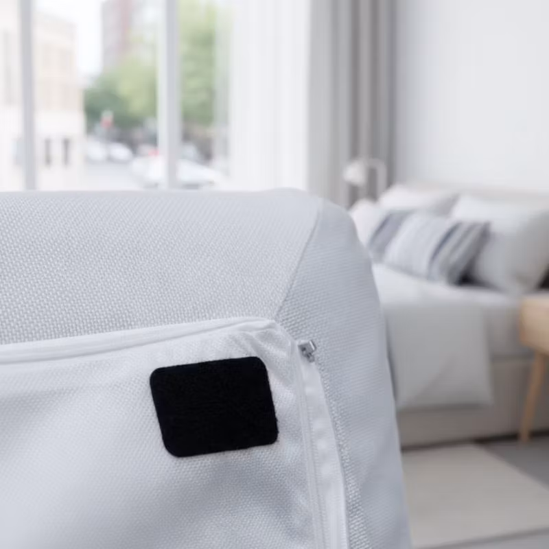 - Fäst andra delen: Lossa det sista skyddspappret och tryck fast den andra ytan (t.ex. dynan eller mattan) mot fästet.