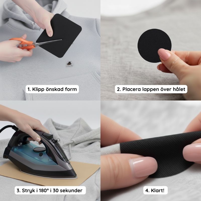 Påstrykbara laglappar är självhäftande tygbitar med värmeaktiverat lim som fästs med strykjärn. De är ett enkelt sätt att reparera kläder hemma utan symaskin. Perfekta för att snabbt laga jeans, t-shirts, luvtröjor eller andra vardagsplagg.