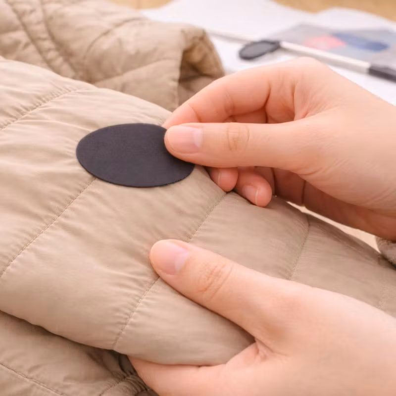 Lagningslapparna är tillverkade i slitstarkt syntettyg med ett kraftigt självhäftande premiumlim som fäster på nylon, polyester och liknande material. De är vattenavvisande, följsamma och utvecklade för att klara regn, snö och aktiv vardagsanvändning.