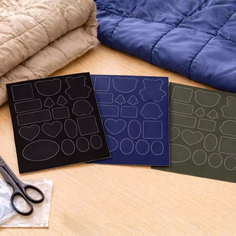 Du får ett klippbart ark för större revor samt ett ark med färdigskurna former för mindre hål eller snygga lagningar. Kombinationen gör paketet flexibelt och användbart för de flesta typer av skador.