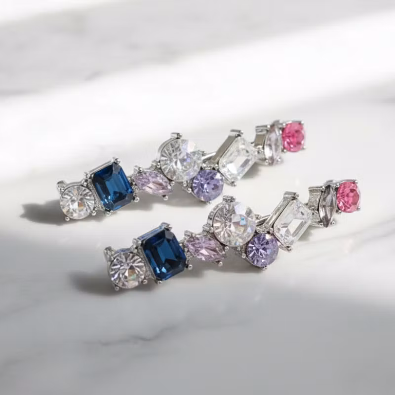 Vårt skosmycke i silver med 8 färgade stenar är en riktig blickfångare. Smycket kombinerar klassisk elegans med en modern twist genom sina olika slipningar och färger – från djupblått och rubinrött till kristallklart och ljust rosa.
